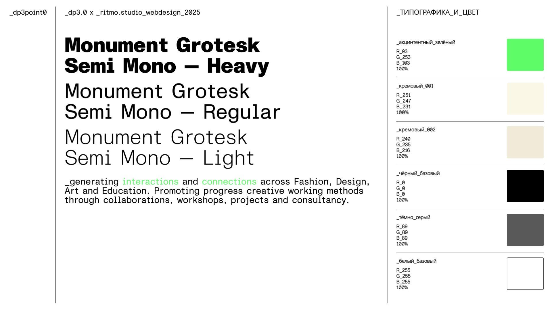 Для айдентики и дизайна сайта был применён шрифт «Monument Grotesk Semi Mono» от берлинской шрифтовой студии «ABC Dinamo», который со слов заказчика создаёт подлинное взаимодействие и установление связей между сферами моды, дизайна, искусства и образования. Дополнительно все нули содержат слэш.