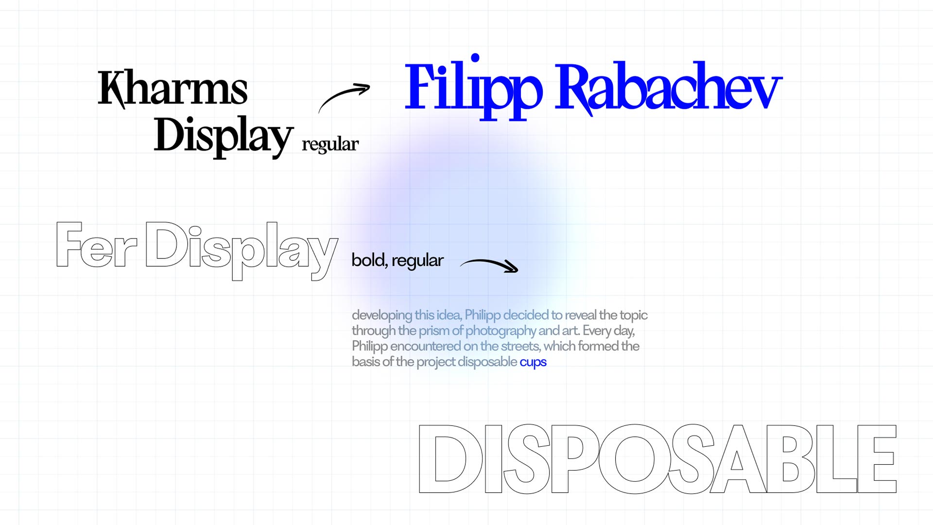В проекте мы использовали шрифт Kharms Display regular для логотипа художника и Fer Display в начертании bold для заголовков и в начертании regular для остального текста.