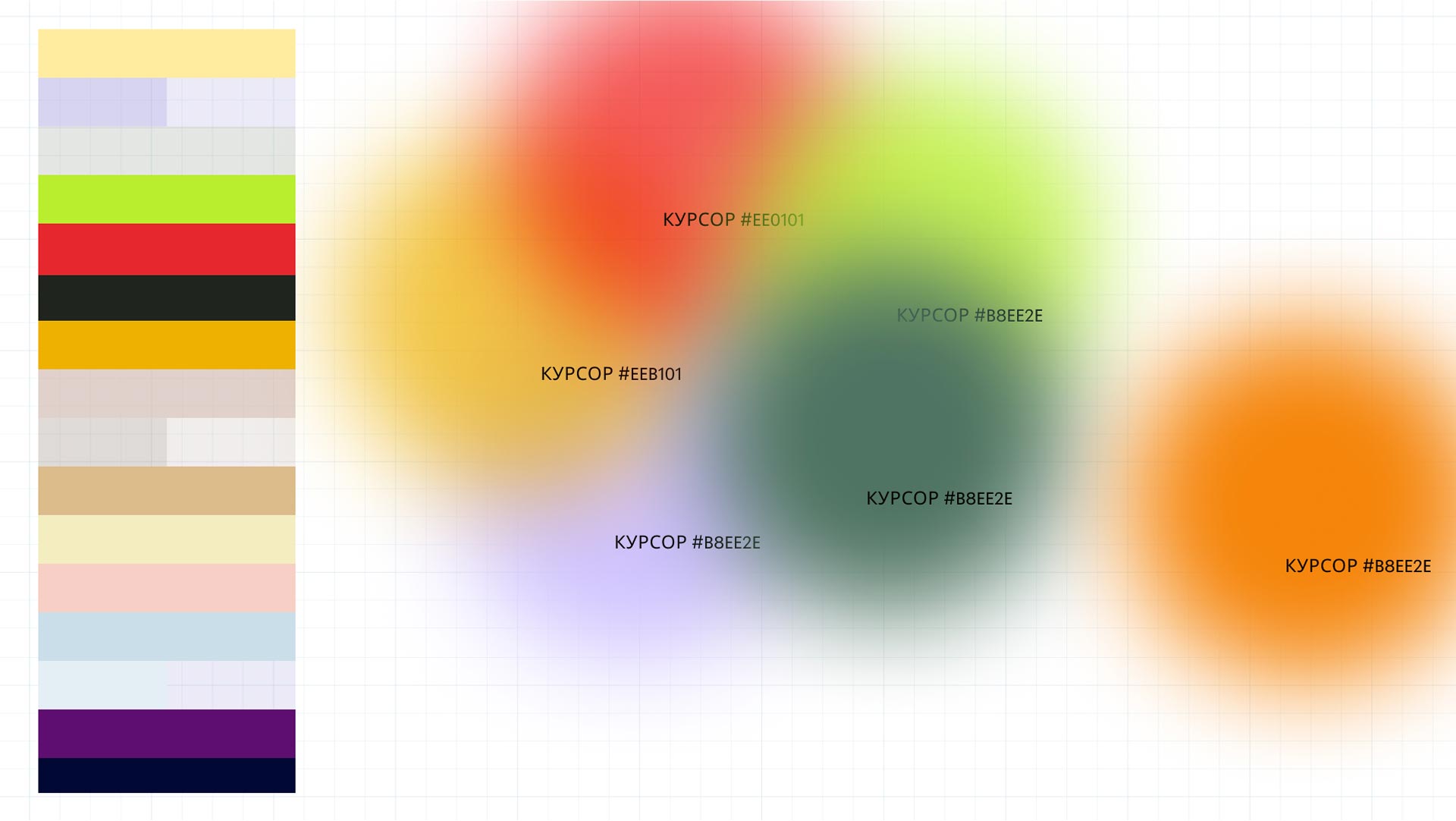 В основу сайта легла сетка от художественного коврика для резки. Дополнительно нам хотелось создать возможность смены фона, иными словами «темы», поэтому мы разработали интерфейс для этих элементов. А чтобы добавить немного креатива – добавили размытое движение цвета для курсора пользователя. Слева мы добавили прогресс бар, просто нам так захотелось.